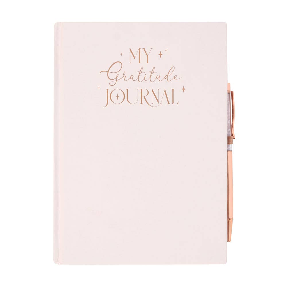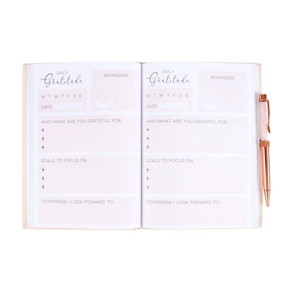 This sleek gratitude journal features printed prompts perfect for tracking daily affirmations, goals and lists of things to be thankful for. Includes a matching rose quartz chip ballpoint pen and makes a meaningful and practical gift for those with big dreams. A5. 100 sheets / 200 lined pages.